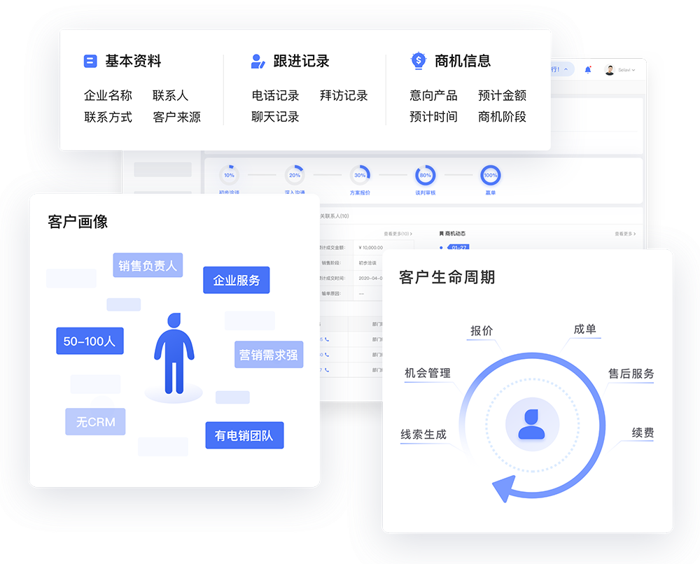 精细化客户管理: 360°客户画像,全面记录客户信息与跟进记录,以精细客户管理高速转化商机