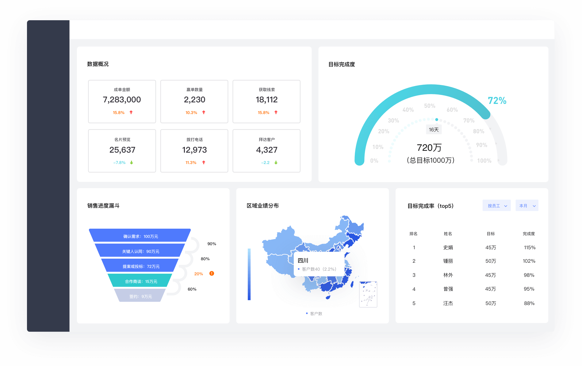 销售业绩可视化:业绩动态可视化呈现,实时掌握销售进度,商机漏斗全局呈现,智能预测团队业绩