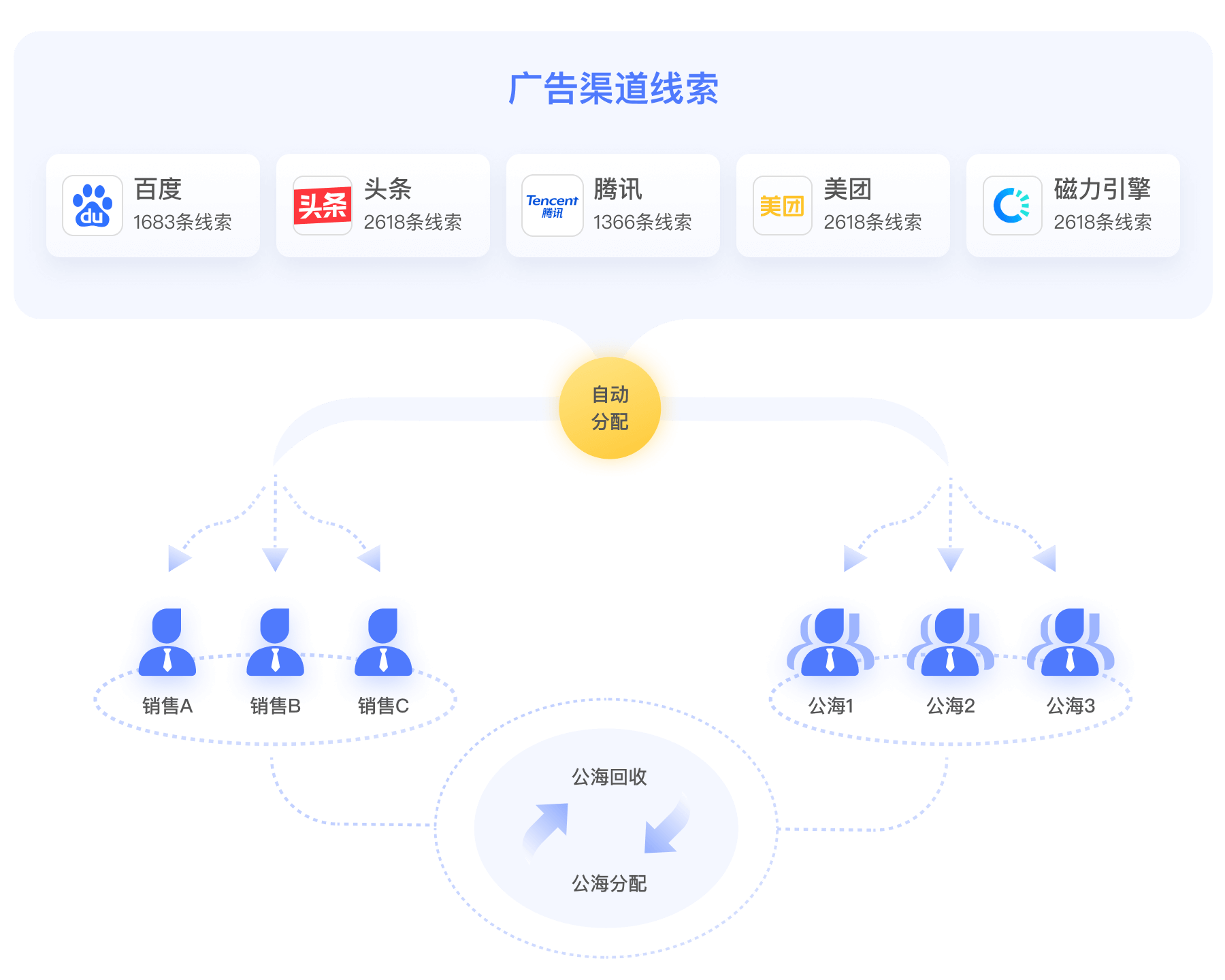 线索自动入库分配: 自定义分配规则,根据分配引擎自动分配客资,提高线索流转效率,减少客户流失