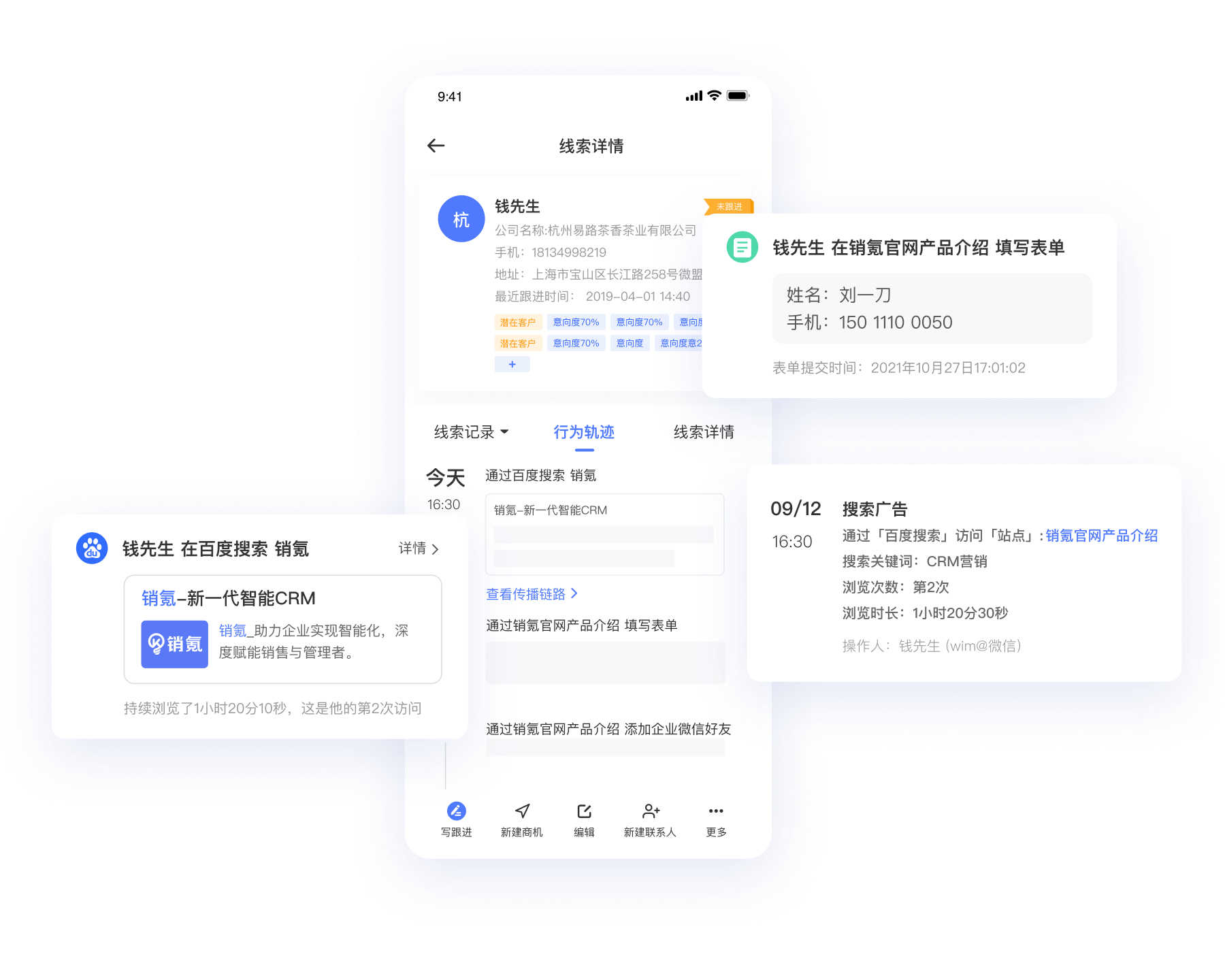行为轨迹追踪: 销氪CRM及企微侧边栏均可展示用户搜索关键词、浏览页面、浏览时间、停留时长等行为轨迹,精准掌握客户意向*24小时实时推送