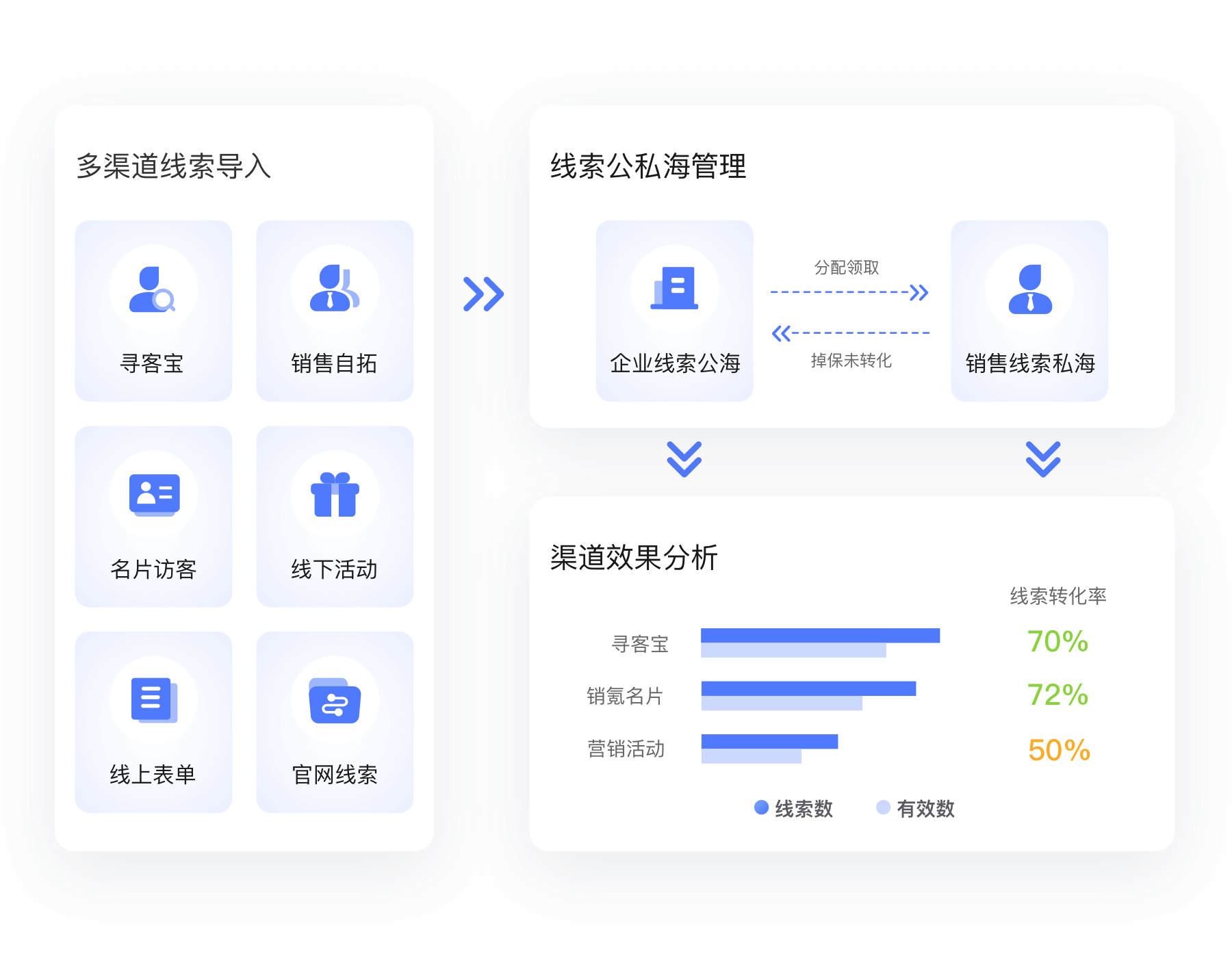 多渠道线索统一管理: 聚合寻客宝、名片、官网注册、市场推广、销售自拓等多渠道线索,实现对线索的统一管理