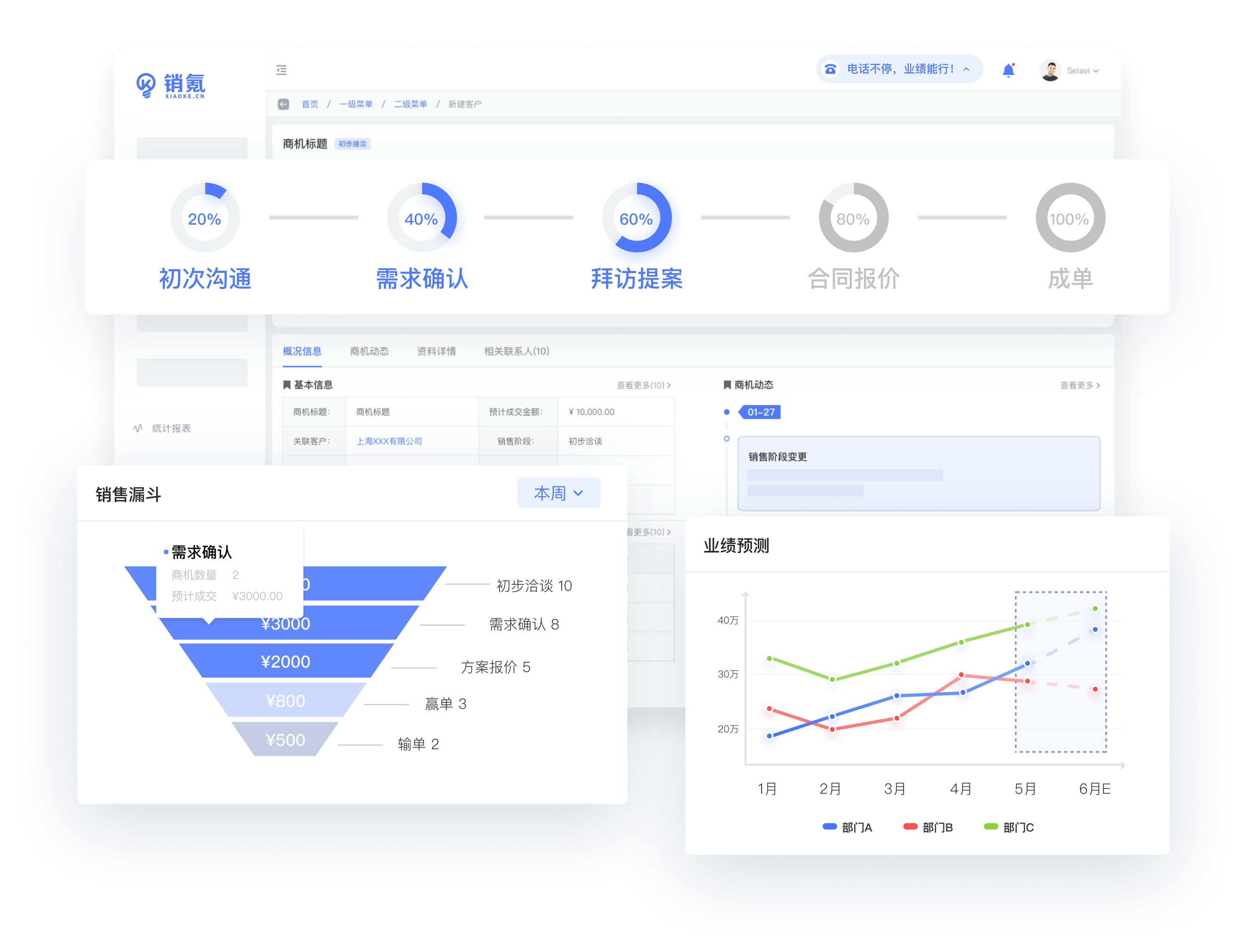 销售漏斗分析: 全局客户漏斗分析,可视化所有商机状态分布,洞悉问题环节