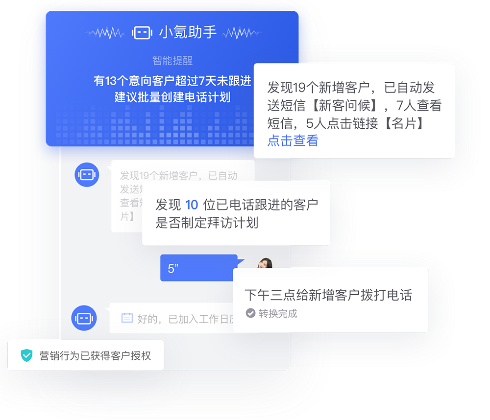 智能判别客户状态、批量自动营销: 机器学习销售跟进习惯+主动追踪客户行为,智能提供营销建议,提升转化效果