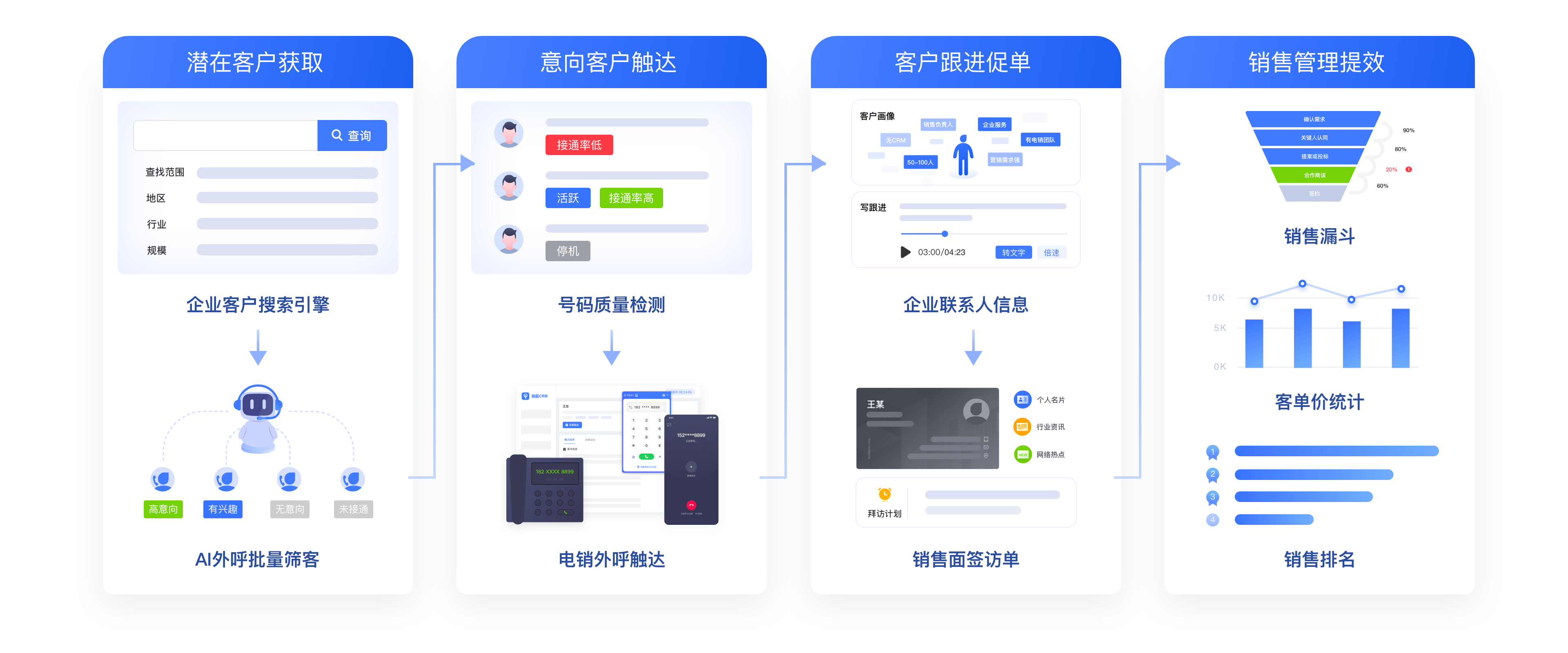 号码质量提前检测,剔除低质无效号码: 大数据智能检测号码质量与活跃度,过滤空号、错号与接听意愿低等无效号码,有效节省销售精力