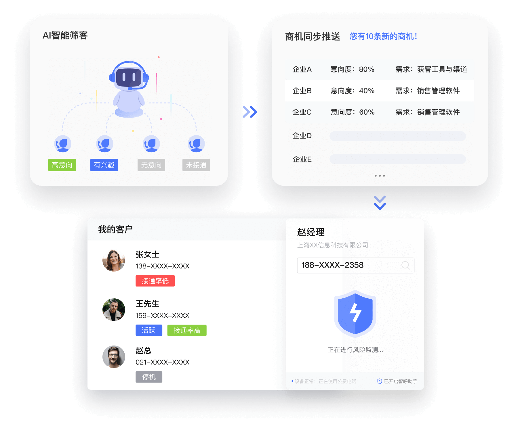 号码质量提前检测,剔除低质无效号码: 大数据智能检测号码质量与活跃度,过滤空号、错号与接听意愿低等无效号码,有效节省销售精力