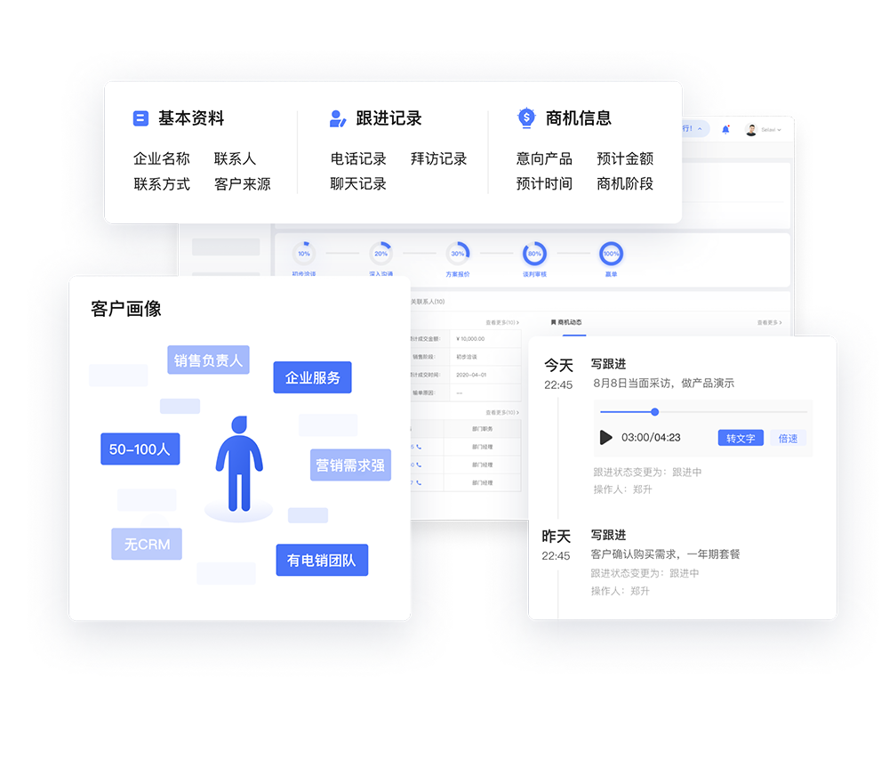 客户阶段管理,精细化管理促转化: 管理员灵活自定义客户跟进阶段标准,从线索到成单的全流程推进记录,以规范化管理加速商机转化