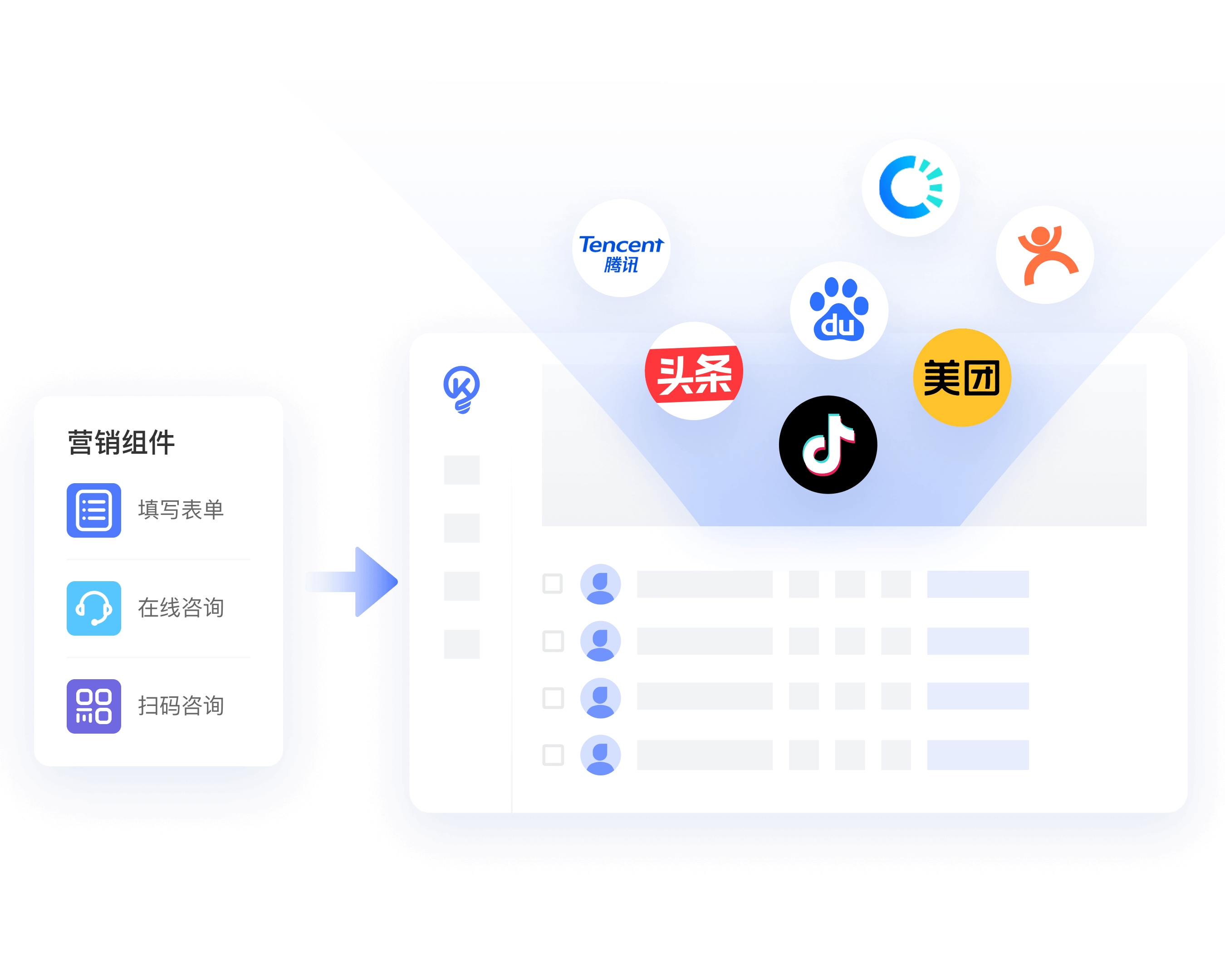 主流广告渠道: 打通百度、腾讯、巨量引擎、美团点评、磁力引擎等主流渠道,广告线索自动归集,统一流转至销氪CRM跟进管理