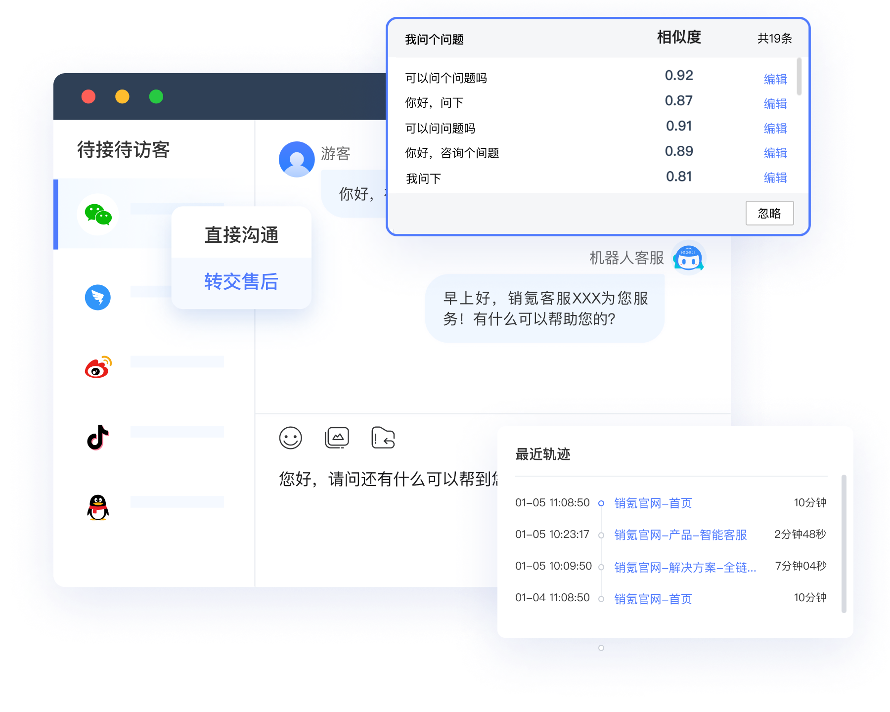 智能坐席分配,追踪用户行为轨迹: 最优化服务接待策略,自定义分配方式,高效分配人工和机器人接待;追踪用户行为轨迹,精准服务营销