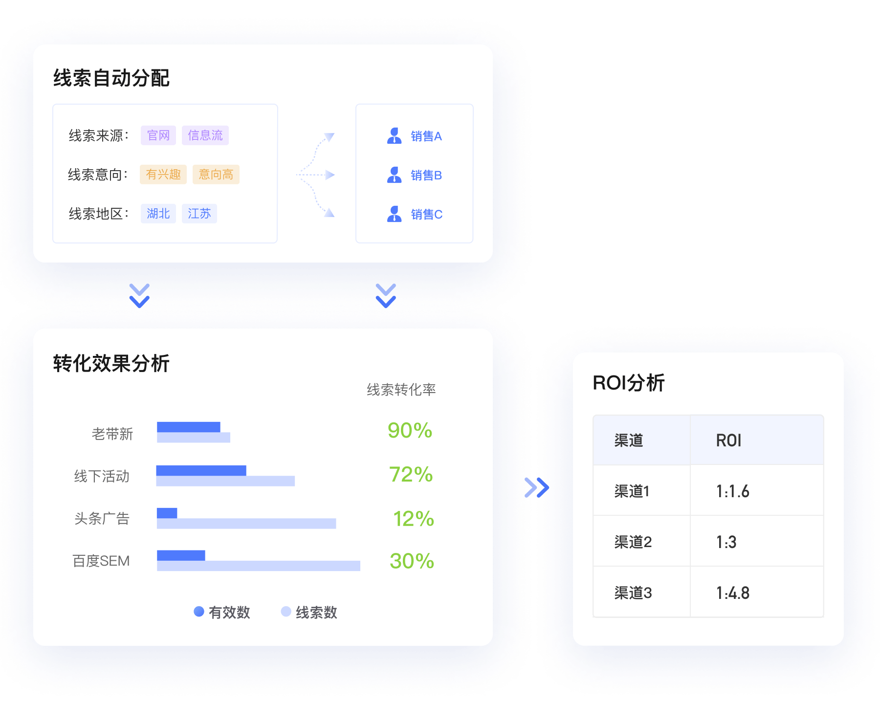 推广渠道转化分析: 线索成交全链路打通,转化效果实时分析,甄别优质推广渠道,优化广告投放策略
