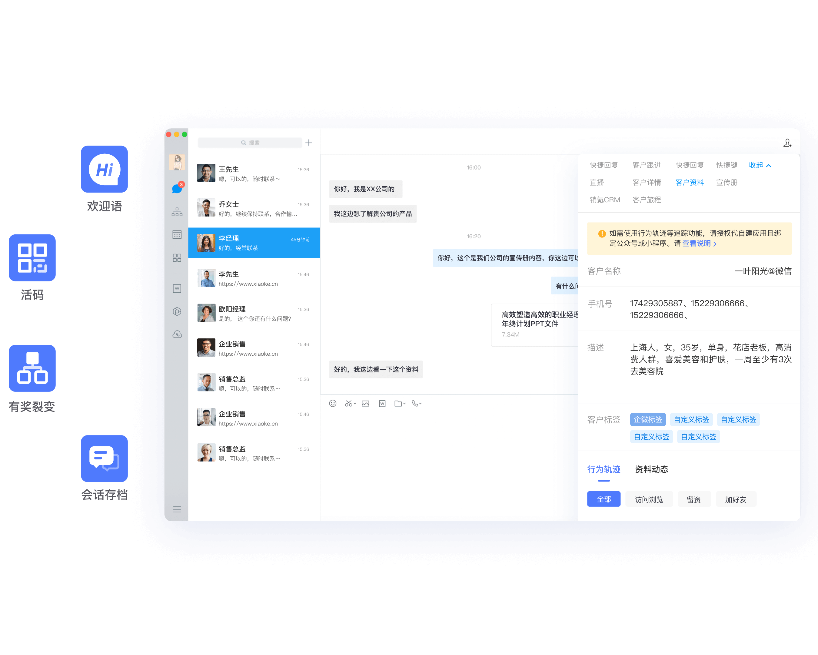 持续跟进运营: 通过企微侧边栏,群发智能名片、宣传册等宣传物料,分享轨迹、用户行为轨迹等清晰可见,加速客户转化